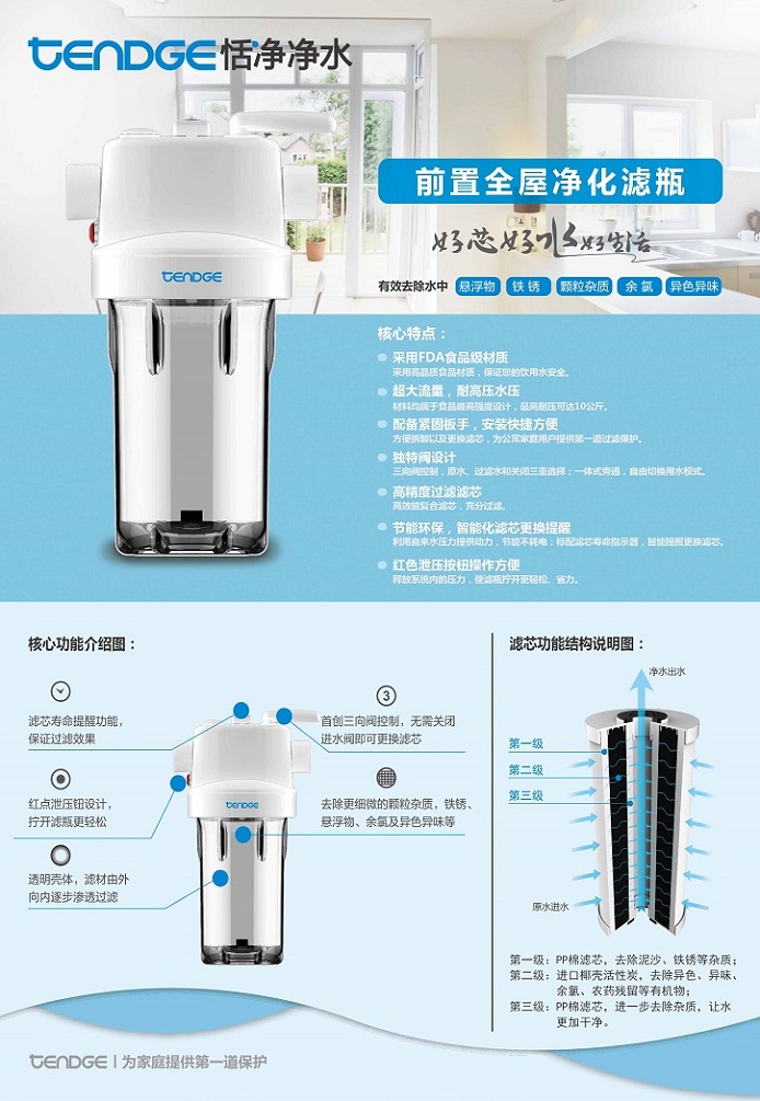 恬凈前置全屋凈化濾瓶TQ-P2能有效去除水中的懸浮物、鐵銹、顆粒雜質、余氯、異色異味,它采用FDA食品級材質,高精度過濾濾芯,體積小巧,安裝方便。恬凈前置全屋凈化濾瓶TQ-P2能承受高水壓,流量超大,智能濾芯提醒功能,節(jié)能環(huán)保。