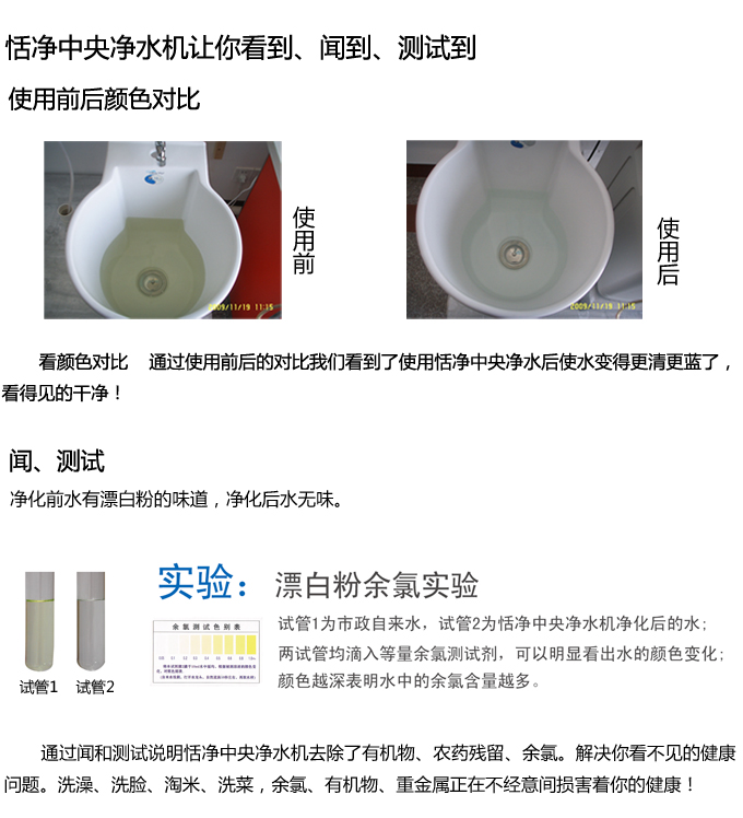 全屋凈水中央凈水機(jī)有效去除水中的異色、異味;進(jìn)一步濾除水中微小雜質(zhì)、膠狀體;去除水中的漂白粉余氯、農(nóng)藥、重金屬;保留對(duì)人體有益的礦物質(zhì)。使水變得碧清、碧藍(lán),去除對(duì)人體有害的物質(zhì)。