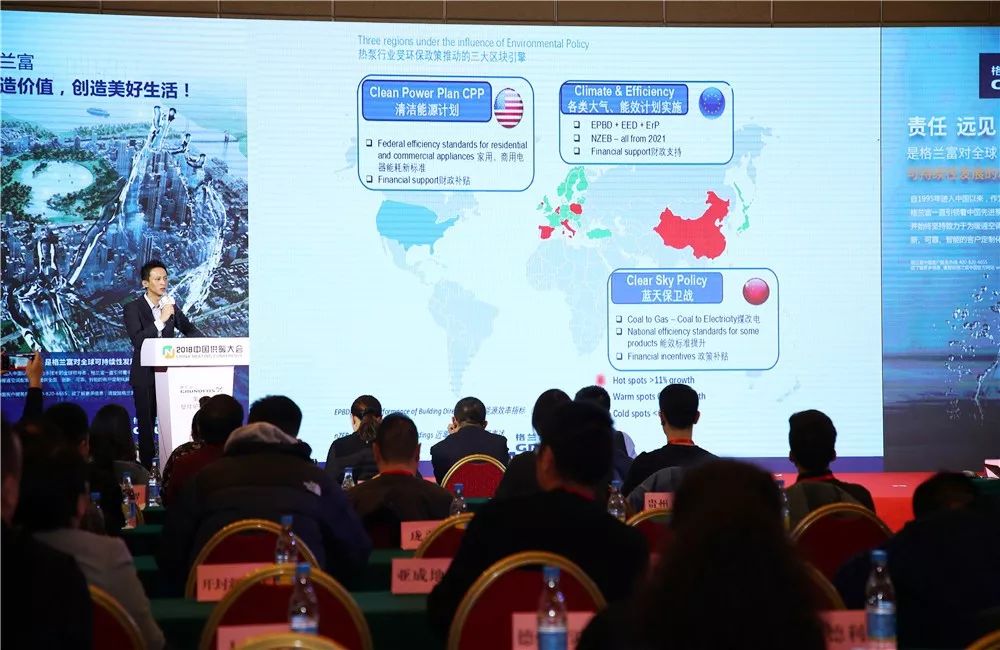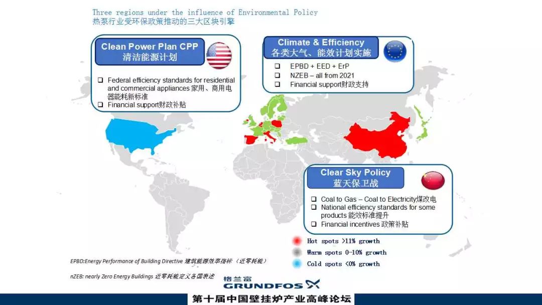 談到區(qū)域市場(chǎng)和熱泵行業(yè)的增速,全球有三大區(qū)塊受到推動(dòng),從左到右分別是美國(guó)、歐洲、中國(guó)。
